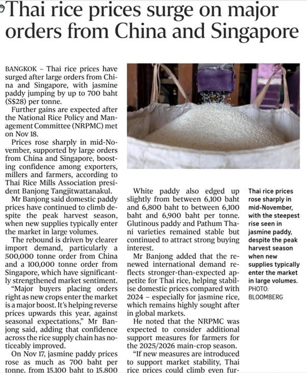 1 week ago Thailand authority announced there is an increase of 800 baht of the price as China had placed an order of 500,000 tons of rice and followed by Singapore which placed 100,000 tons. The followings is a report from www.straitstimes.com: